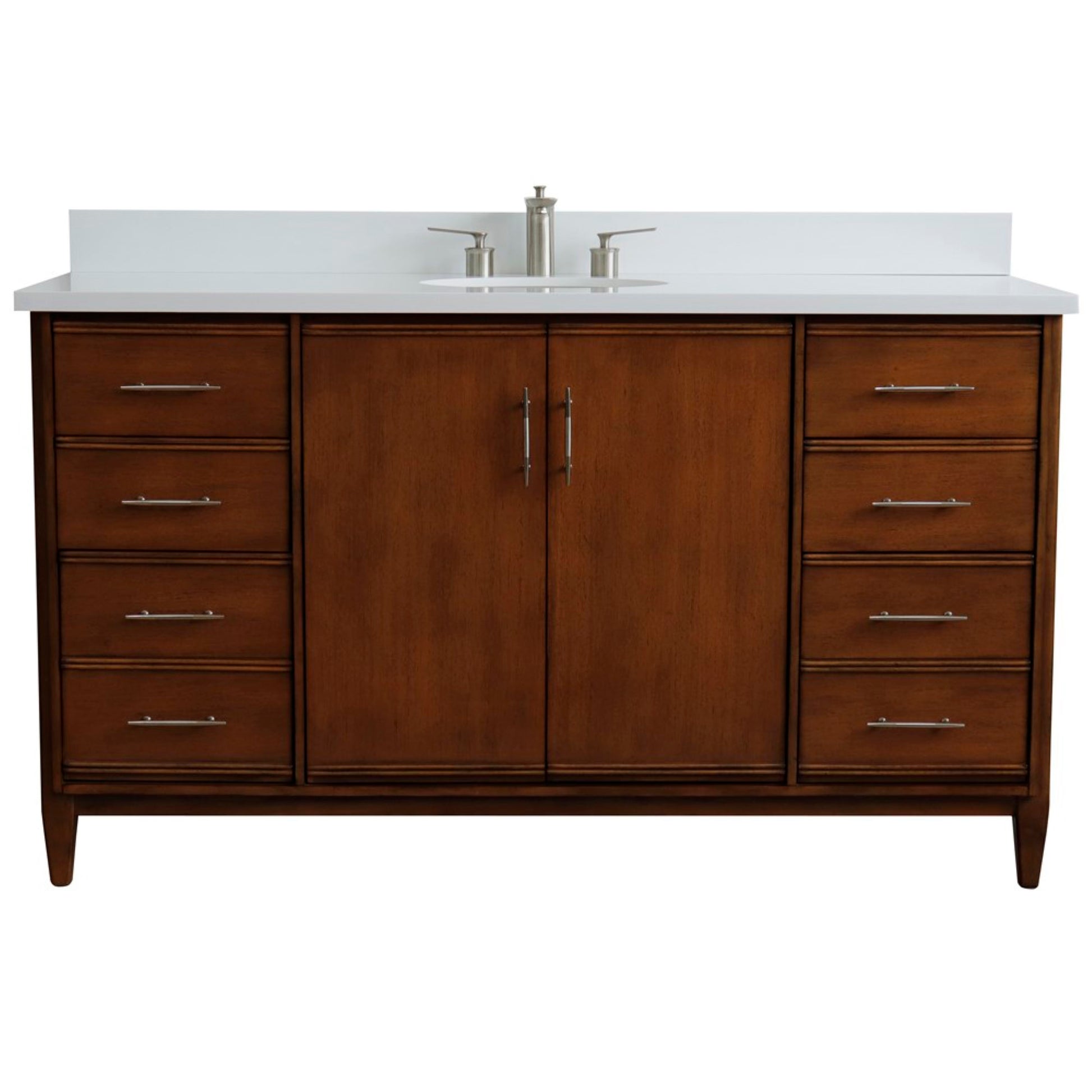 61" Single sink vanity in Walnut finish with White engineered stone and oval sink