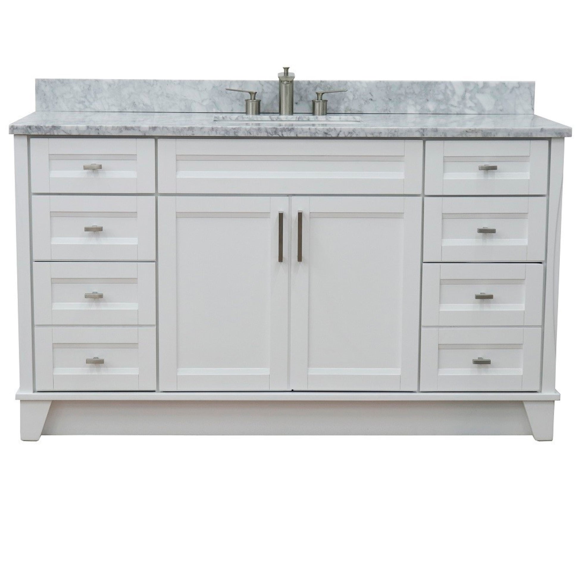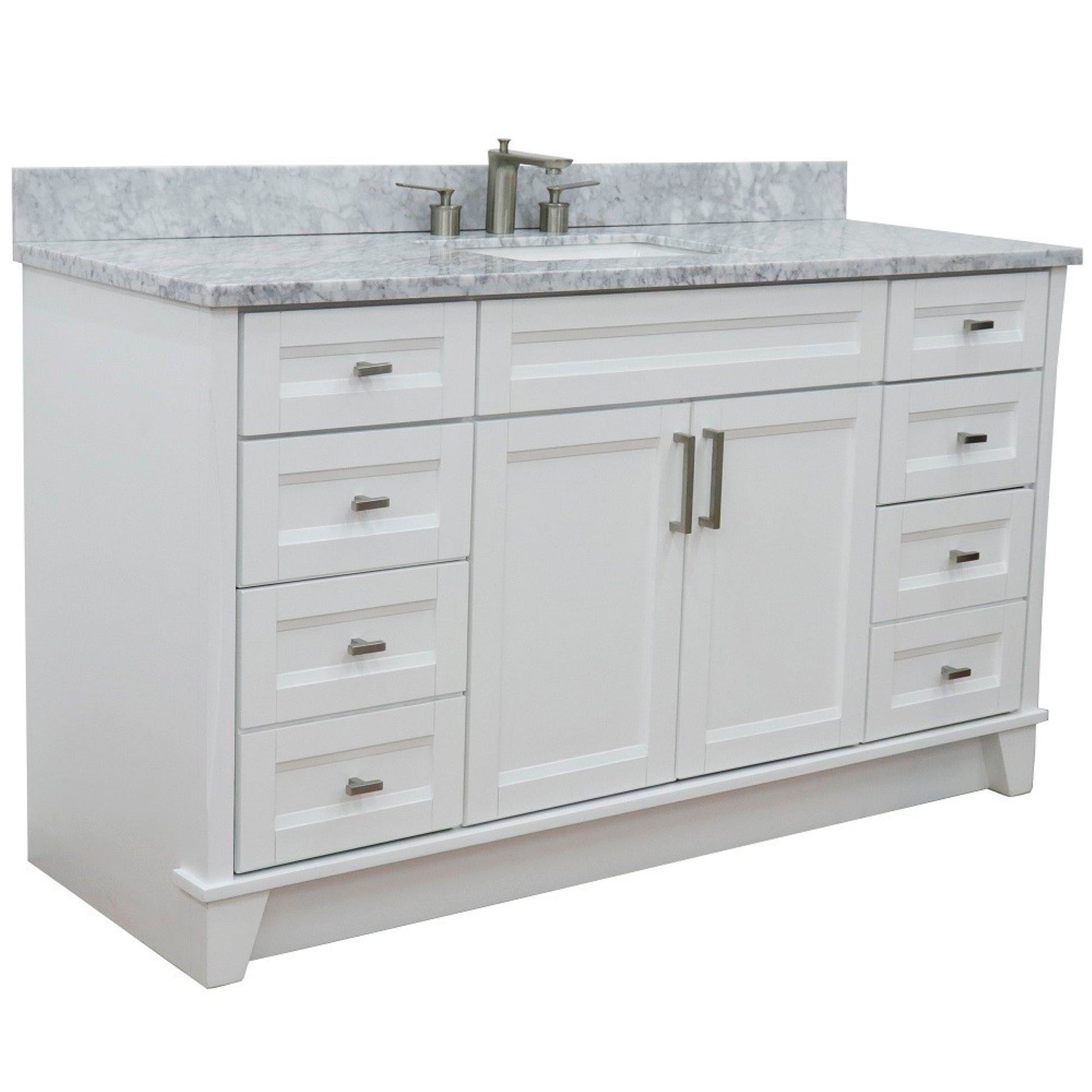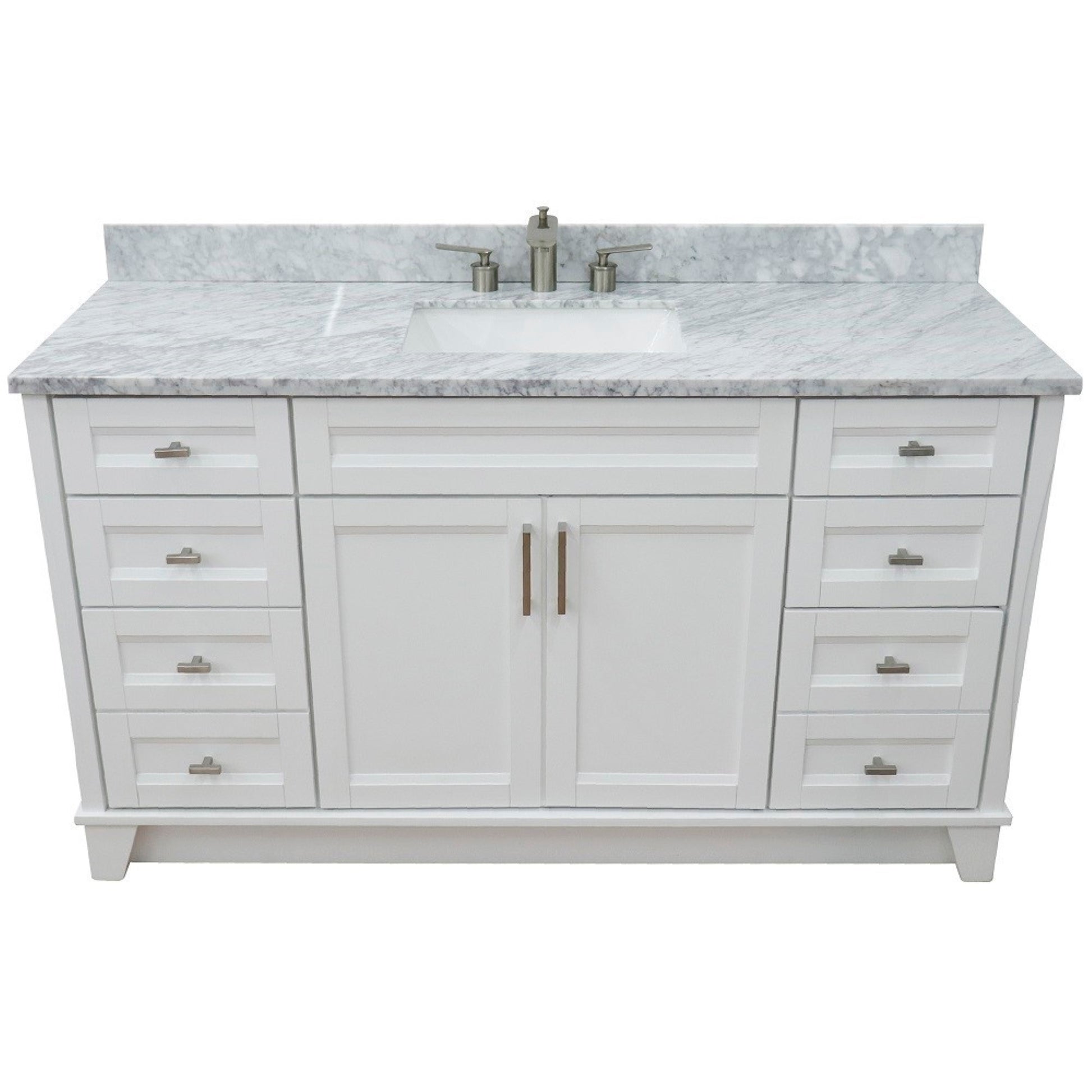 61" Single sink vanity in White finish and White Carrara marble and rectangle sink