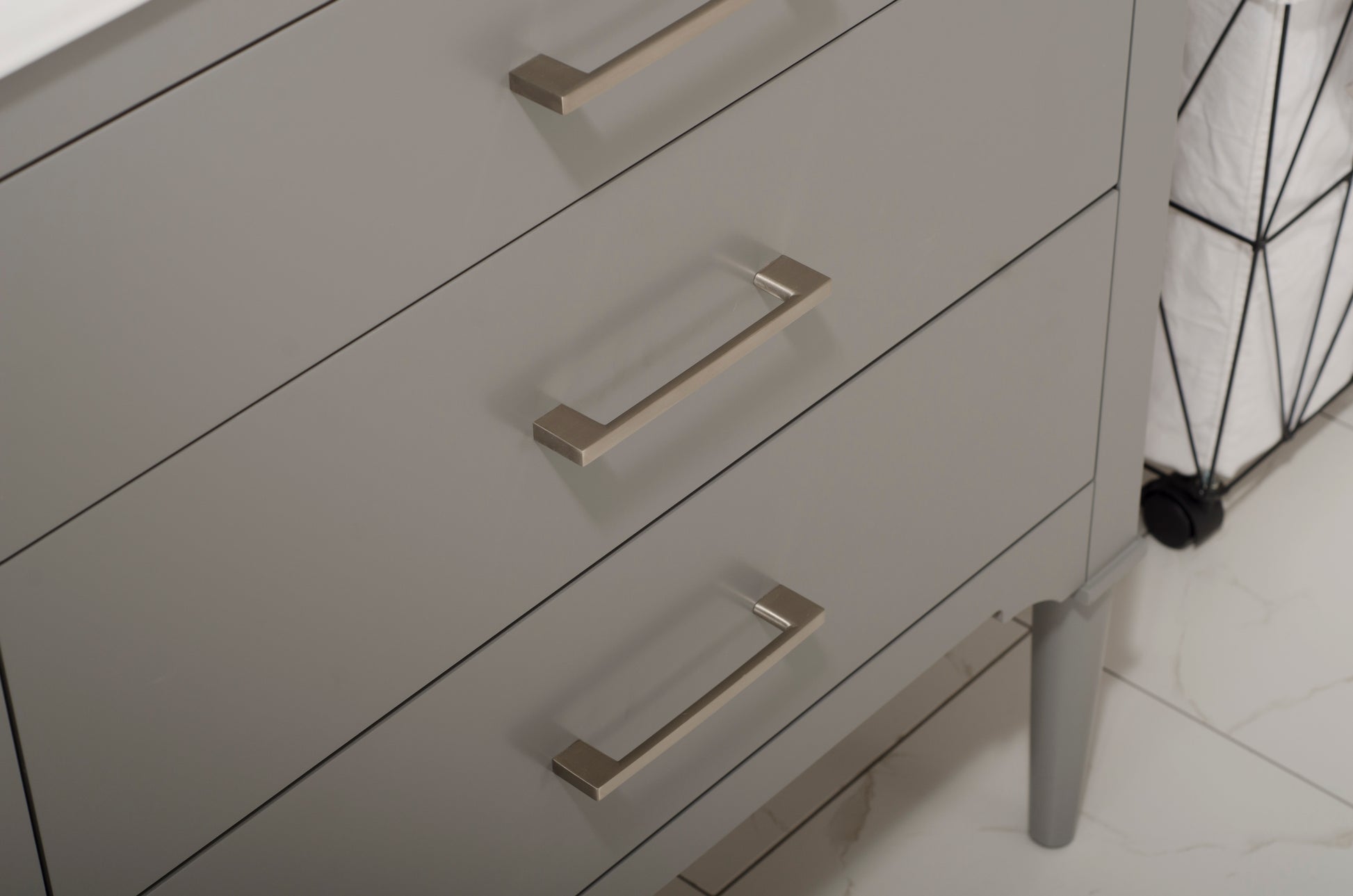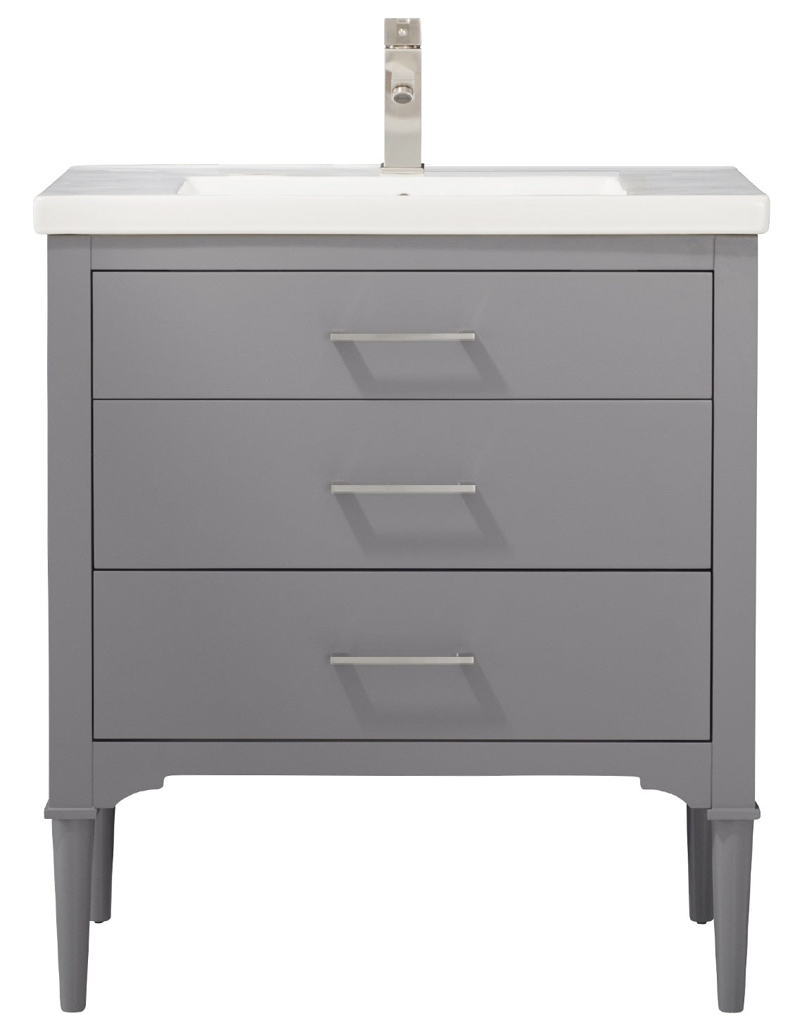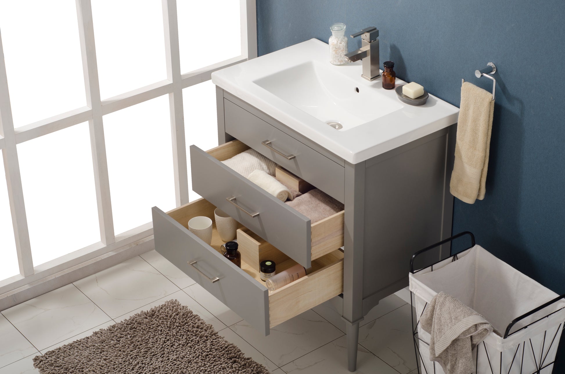 The Mason single sink vanity by Design Element provides the perfect finishing touch to your bathroom remodel project. Made from solid wood and MDF to prevent warping, this vanity will maintain its beauty and functionality year after year. The ceramic countertop and integrated sink with overflow perfectly matches the styling of the cabinet, and is extremely simple to maintain. Each of the 2 fully functional drawers are constructed with dovetail joints and soft close glides. The included brushed finished hardware perfectly compliments the cabinet finish. Faucet and drain are not included.